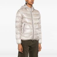Custom men’s hooded down jacket in silver finish, lightweight warmth with full zip closure — sleek winter outerwear.